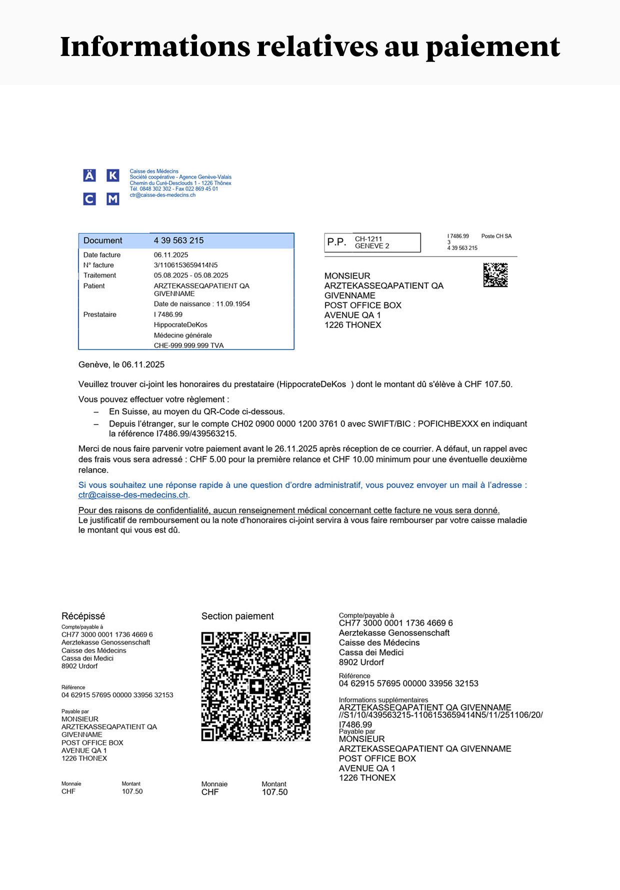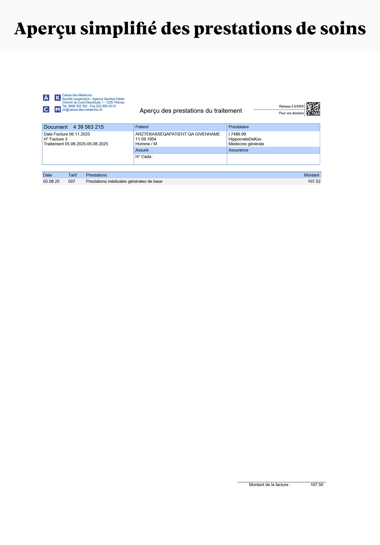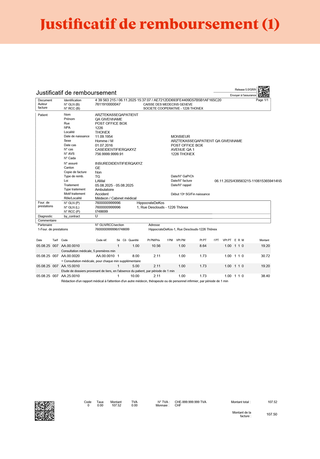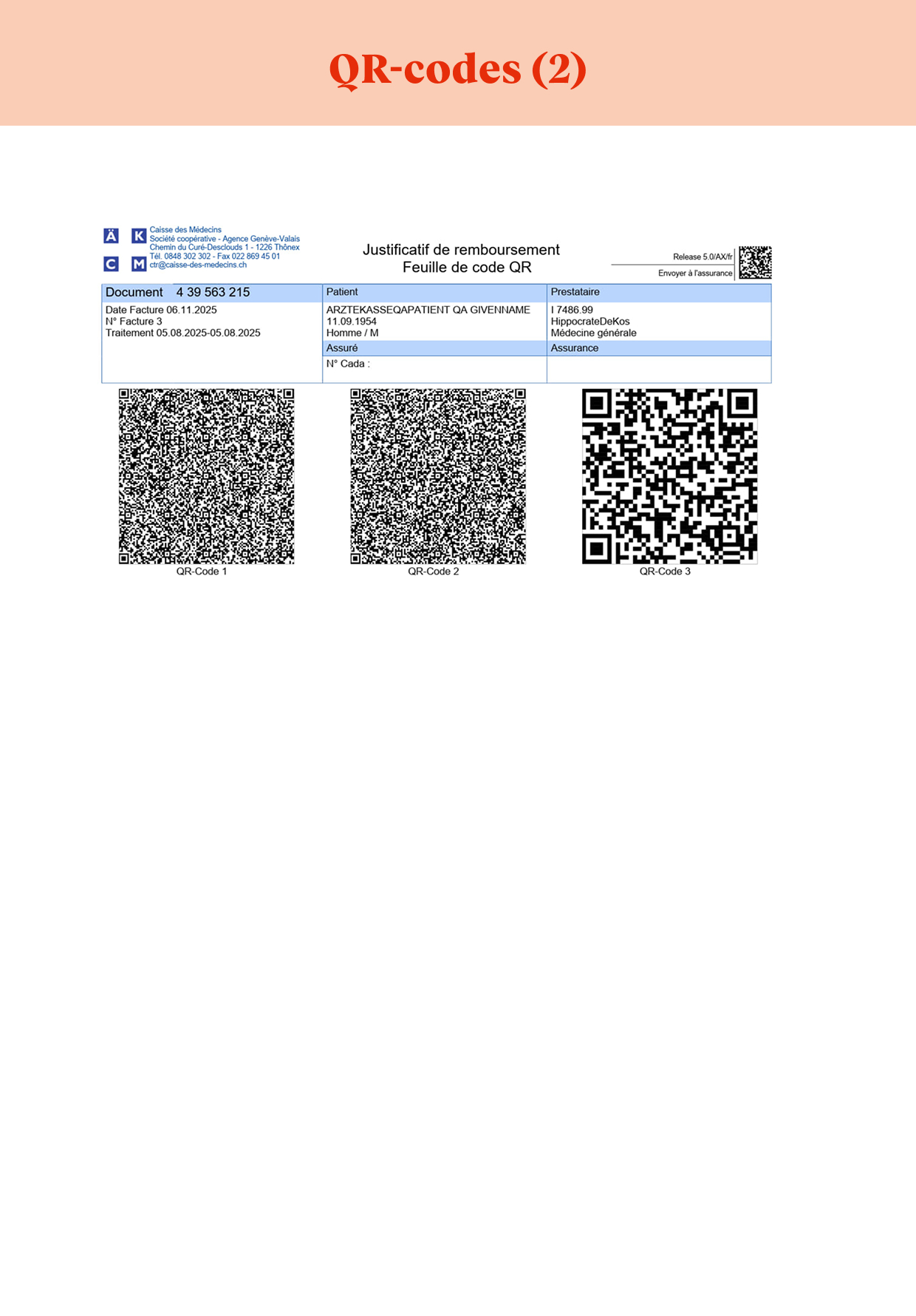 - Une page avec des QR-codes. Ces codes contiennent toutes les informations nécessaires à la gestion de votre facture par votre assureur-maladie.