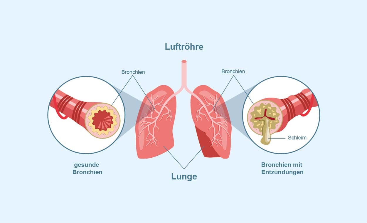 - Ausreichende Flüssigkeitszufuhr, um die Verflüssigung des Bronchialsekrets zu unterstützen.
