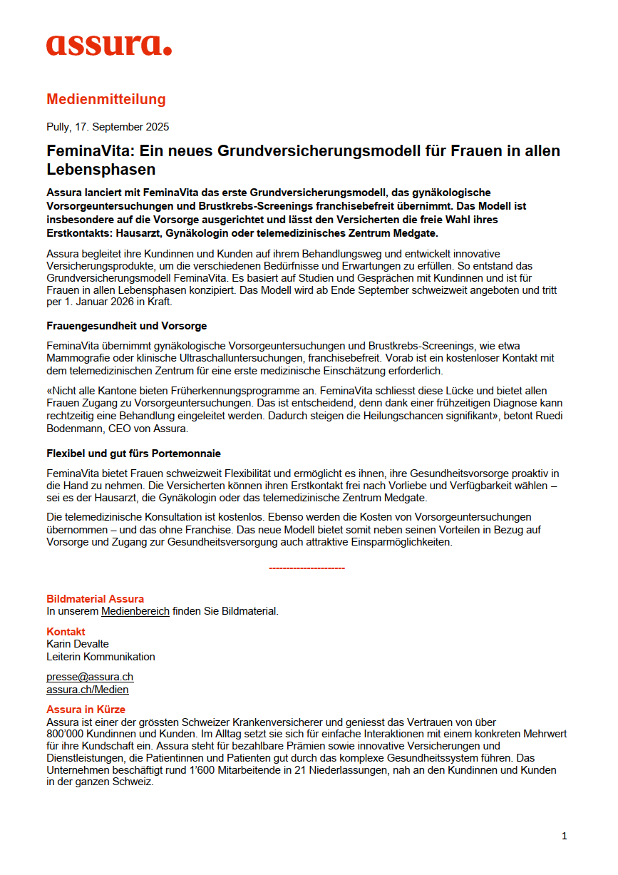 Assura lanciert mit FeminaVita das erste Grundversicherungsmodell, das gynäkologische Vorsorgeuntersuchungen und Brustkrebs-Screenings franchisebefreit übernimmt. Das Modell ist insbesondere auf die Vorsorge ausgerichtet und lässt den Versicherten die freie Wahl ihres Erstkontakts: Hausarzt, Gynäkologin oder telemedizinisches Zentrum Medgate.