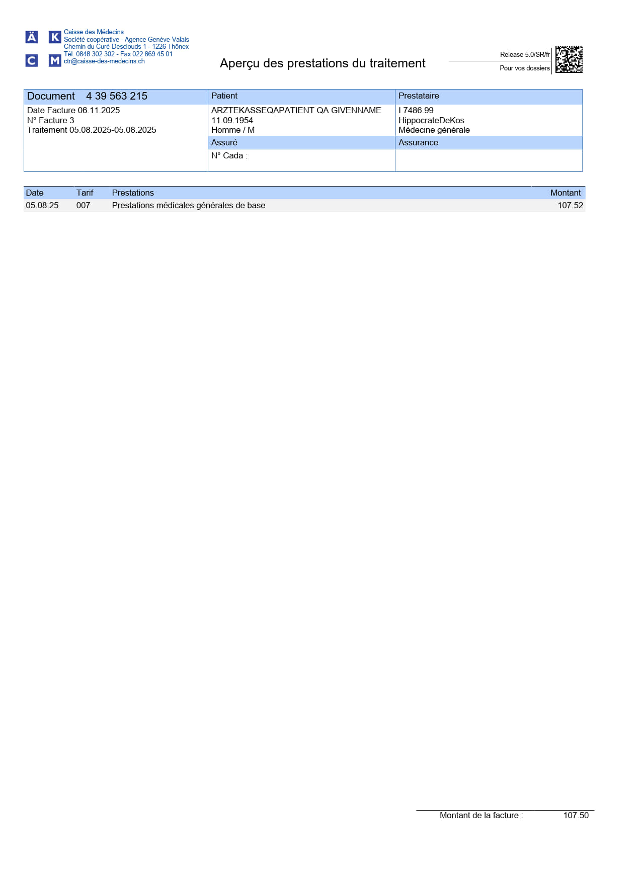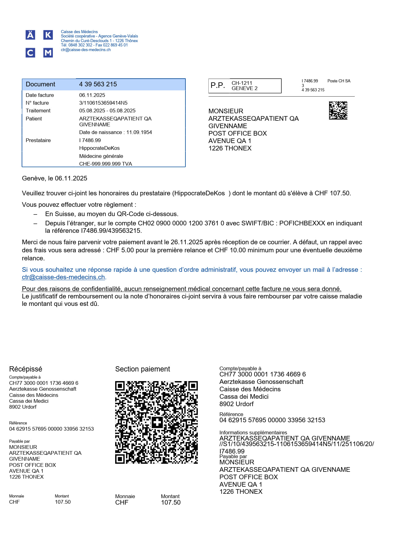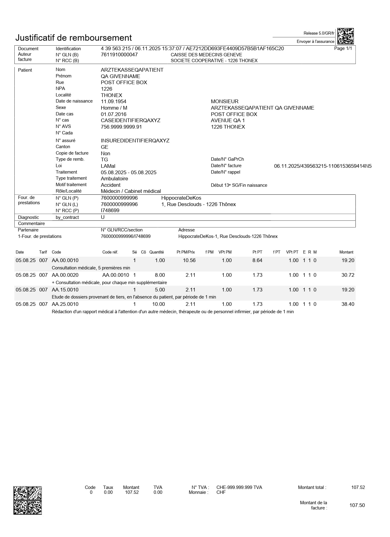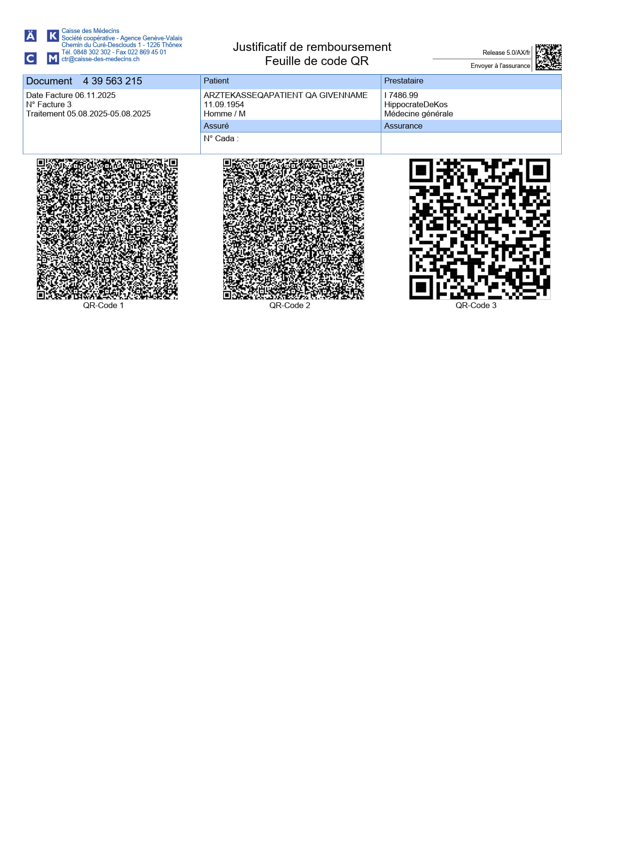 - Une page avec des QR-codes. Ces codes contiennent toutes les informations nécessaires à la gestion de votre facture par votre assureur-maladie.
