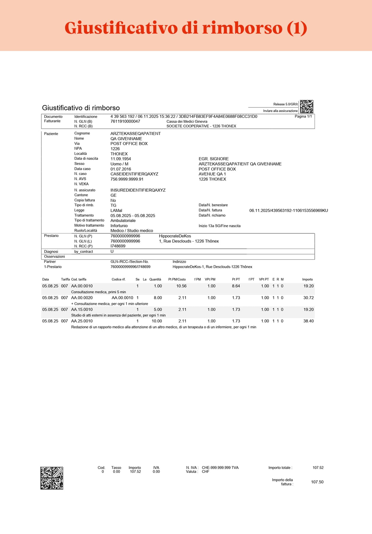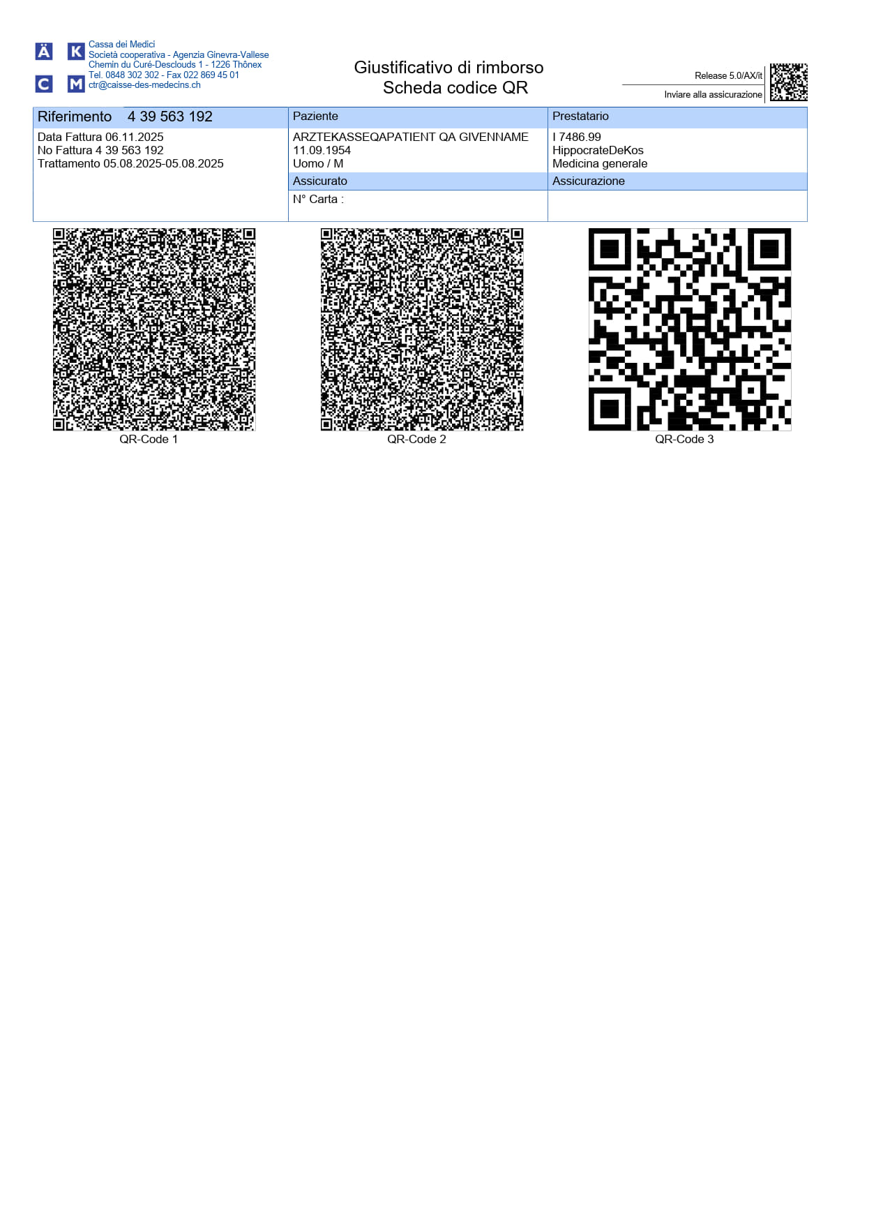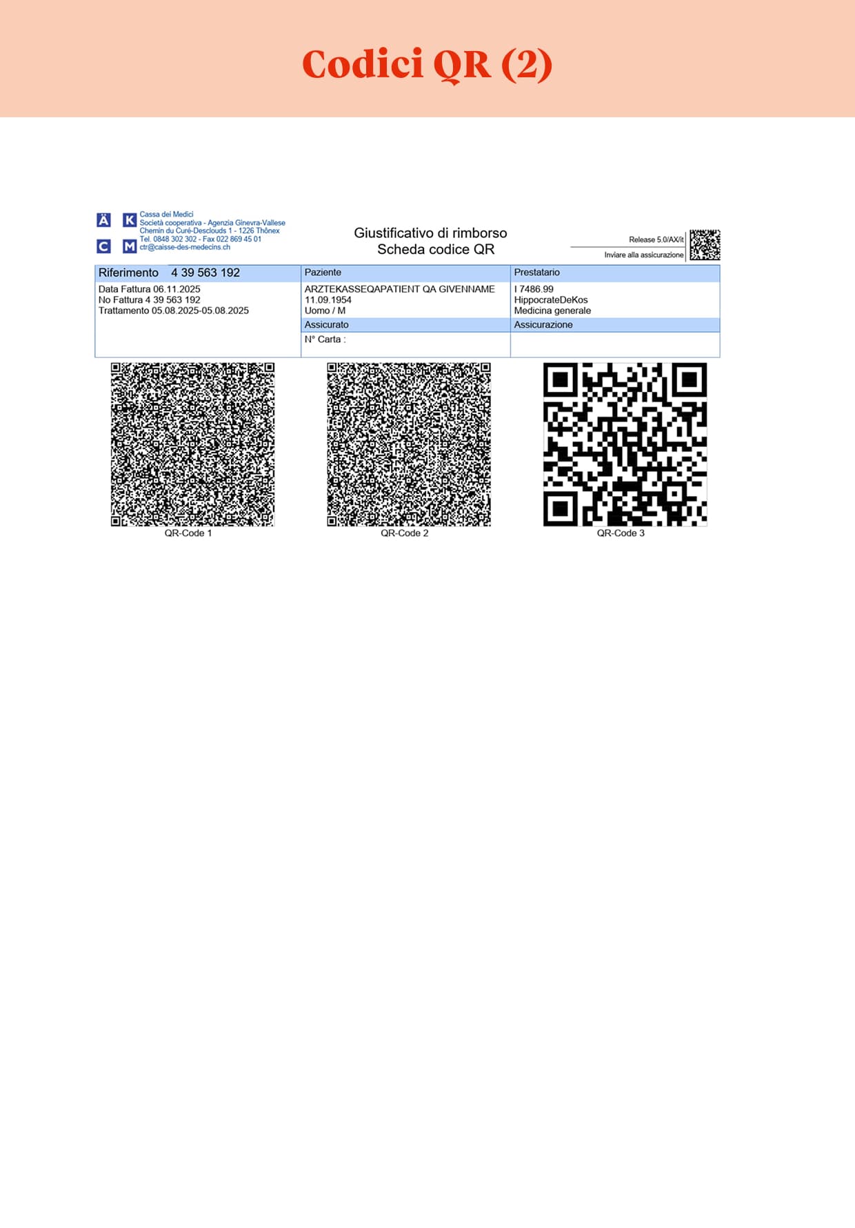 - Una pagina che riporta codici QR contenenti le informazioni necessarie alla gestione delle fatture da parte dell’assicurazione malattie.