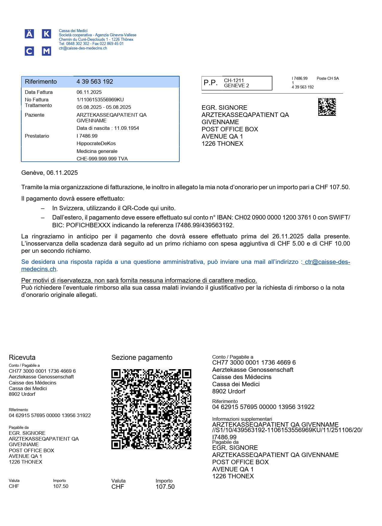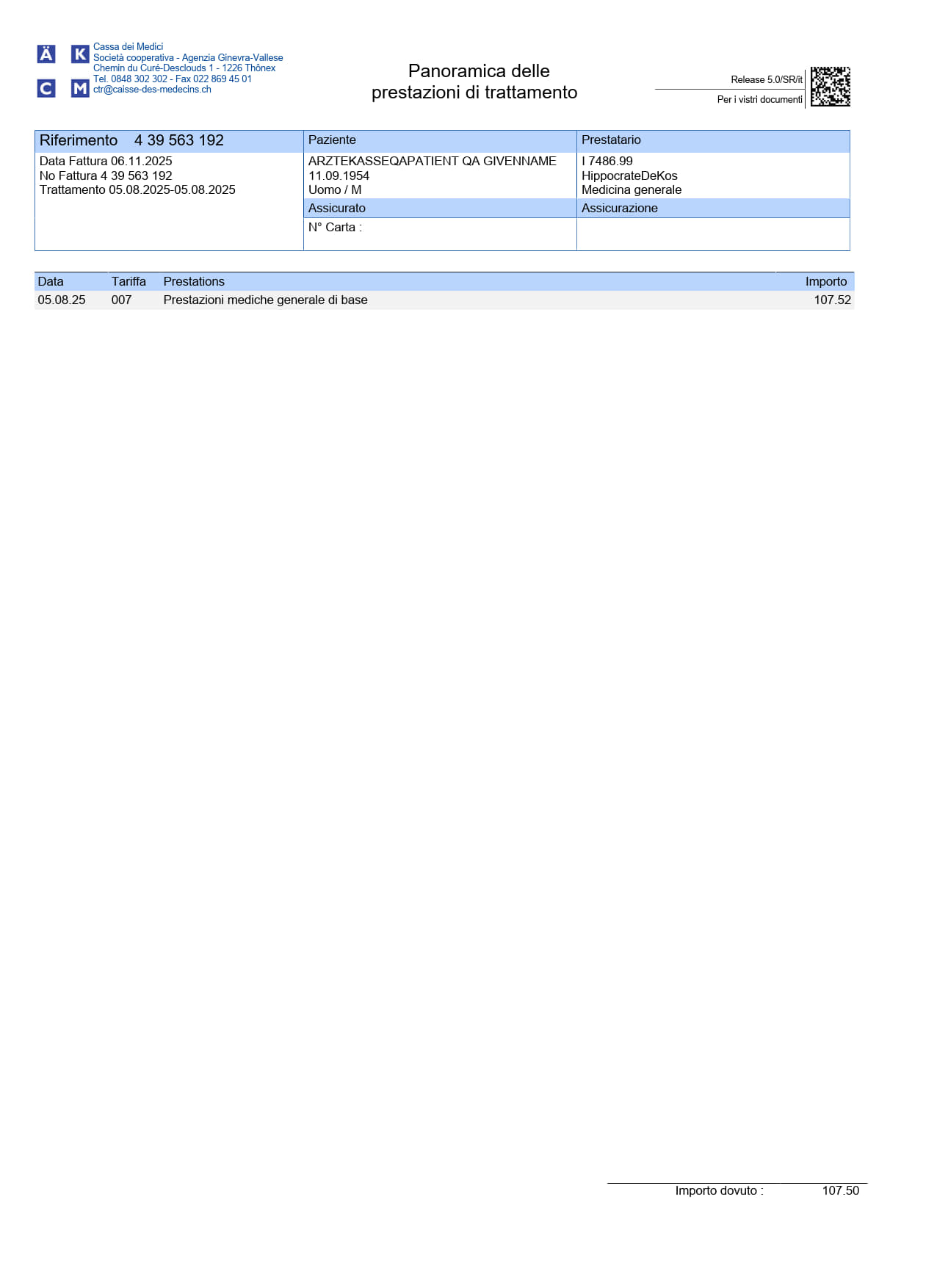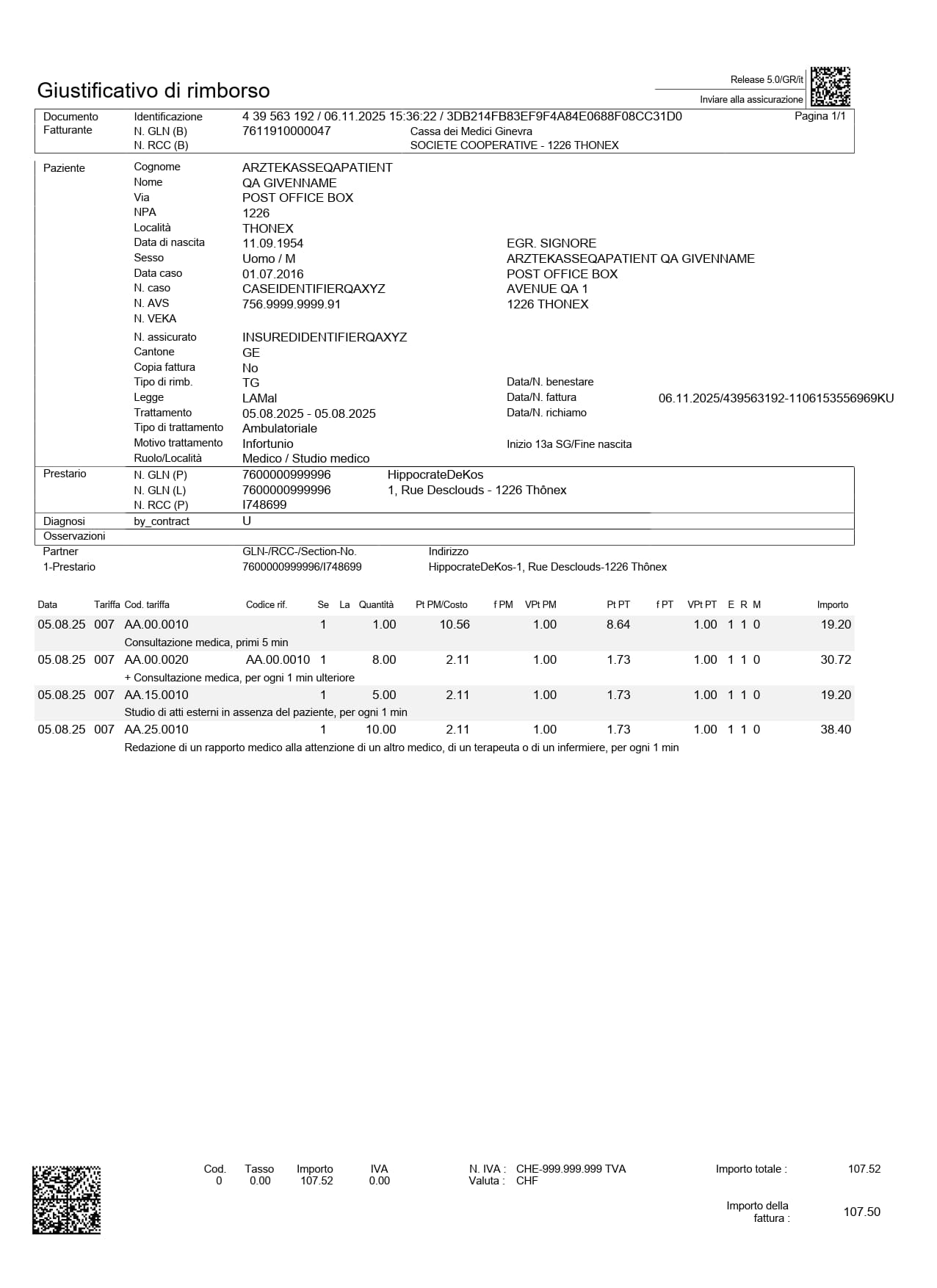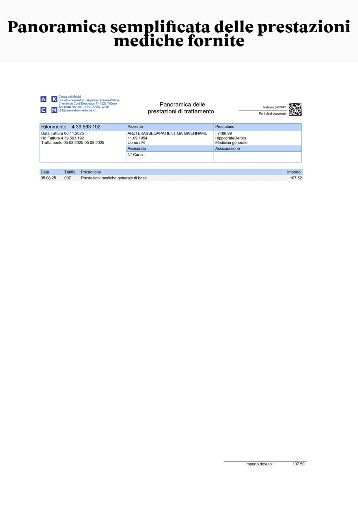 - Una pagina che riporta codici QR contenenti le informazioni necessarie alla gestione delle fatture da parte dell’assicurazione malattie.