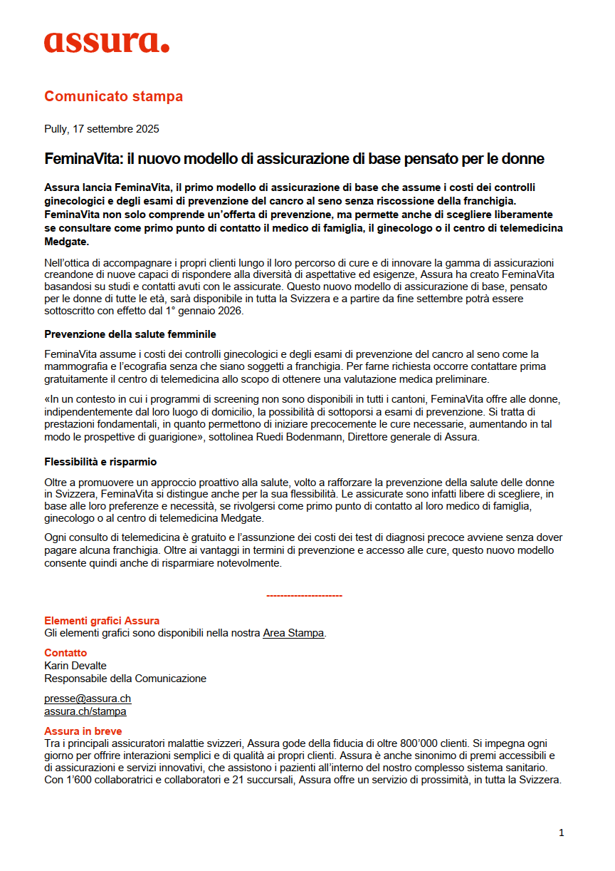 Assura lancia FeminaVita, il primo modello di assicurazione di base che assume i costi dei controlli ginecologici e degli esami di prevenzione del cancro al seno senza riscossione della franchigia. FeminaVita non solo comprende un’offerta di prevenzione, ma permette anche di scegliere liberamente se consultare come primo punto di contatto il medico di famiglia, il ginecologo o il centro di telemedicina Medgate.